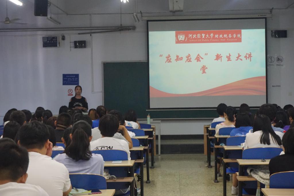 活动开始,朋辈辅导员开门见山的向新生说明本次讲堂主要内容,包括学生手册、教学一览表、校园说法、新生入学适应手册四大板块。首先,朋辈辅导员为新生讲解了《学生手册》中的综合测评办法、优秀学生奖学金评定办法、公寓管理规定、考试违规处理办法等。在解读《教学一览》环节中,朋辈辅导员详细介绍了学分制实施方案、学籍管理办法、修读双学位管理办法、辅修专业制度、选课管理办法等,财政学类教学计划、资产评估教学计划等。在讲解《校园说法》的过程中,朋辈辅导员通过列举真实案例,提醒新生提升安全意识,谨防传销诈骗,加强自我保护,远离校园贷。在新生入学适应手册的讲解中,朋辈辅导员介绍了如何利用学校的各种资源、如何做课题、如何完成一个自己没有经验的任务等。