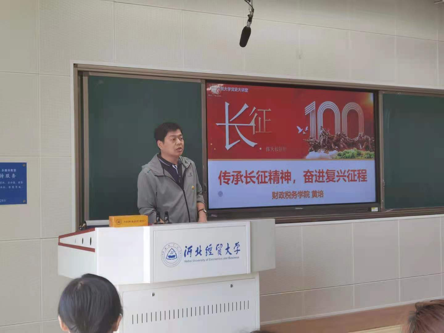 按照学校《党史学习教育实施方案》的要求和财税学院党史学习教育安排,4月29日下午在A教402,学校党史宣讲团成员黄培老师以“传承长征精神 奋进复兴征程”为题作专题宣讲。宣讲会由学院党委书记郝江华主持,师生党员、入党积极分子、学生干部80余人参加学习。