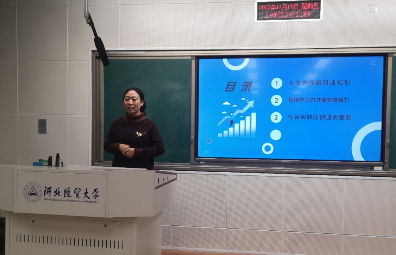 11月17日晚,beat365官网邀请萃邦商贸有限公司经理、校友尹静然在A教103作“从职场小白到小微企业负责人的心路历程”分享交流会。本次交流会党委副书记胡卓理、辅导员陈静波老师出席, 2023级同学参加。