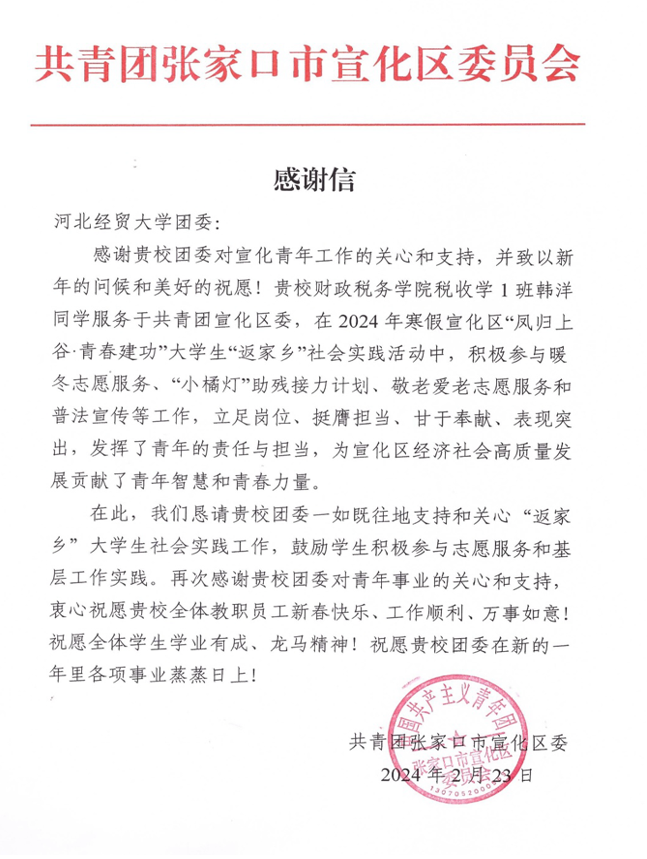 近日,共青团张家口市宣化区委员会向我校发来感谢信,对beat365官网2023级税收学1班韩洋同学2024年寒假在该单位开展的实践工作进行了表扬和感谢。