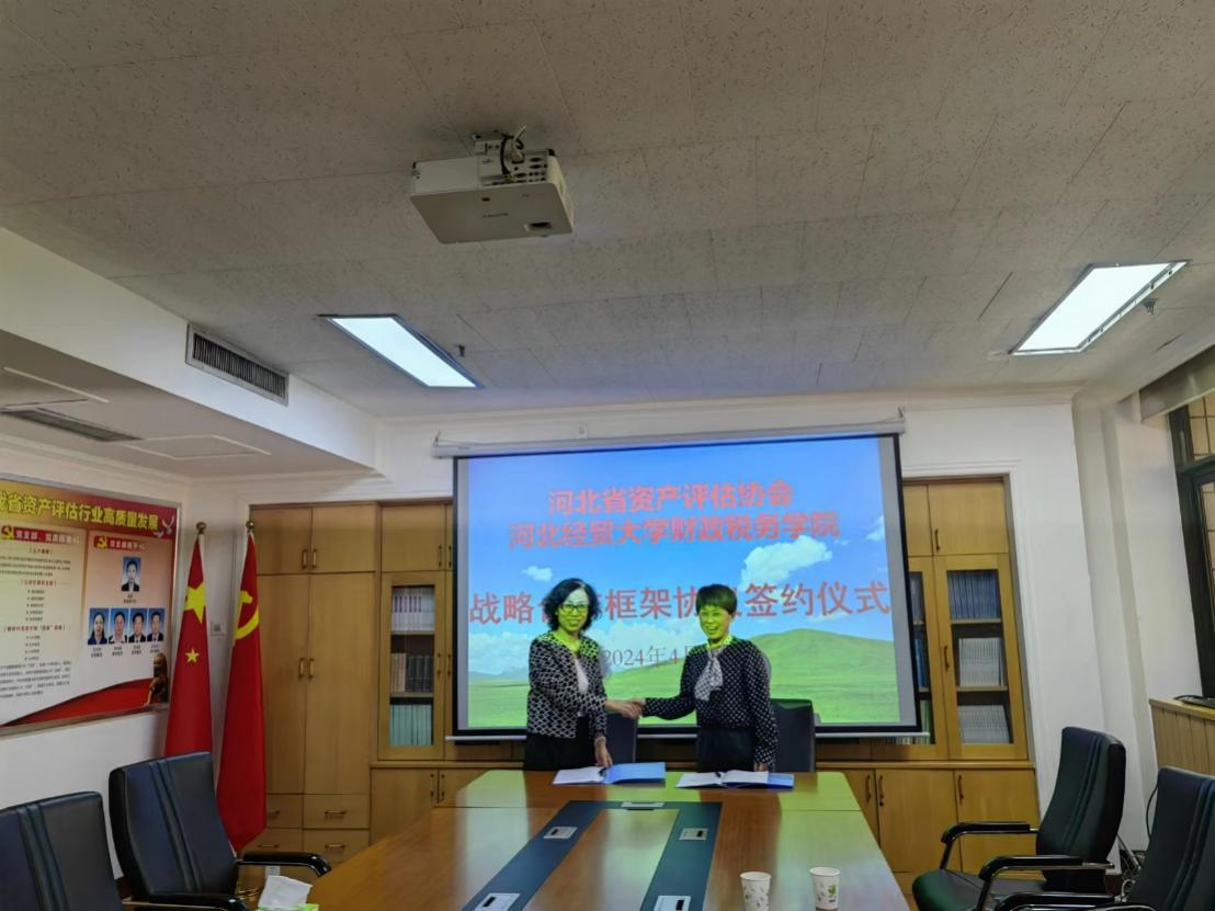 4月24日,beat365英国官方网站与河北省资产评估协会举办战略合作框架协议签约仪式。河北省资产评估协会秘书长吴堃等人和beat365英国官方网站副院长仇晓洁等人出席签约仪式并就合作内容展开深入探讨。