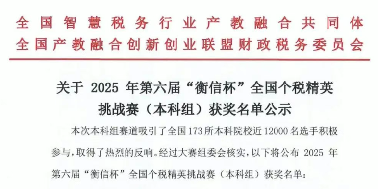 2025年5月,全国智慧税务行业产教融合共同体主办了第六届“衡信杯”全国个税精英挑战赛(本科赛道),共有来自全国173所本科院校的近12000名选手同场竞技,共同展现财税专业领域的知识储备与实践能力。通过系统培训、模拟演练等方式提升学生的专业素养。2025年5月7日至5月20日,通过连续14天的线上比赛,学院93名同学持之以恒地凭借扎实的专业功底和出色的临场发挥,最终脱颖而出,荣获团体赛一等奖,充分展现了beat365官网学子的卓越风采与专业水平。
