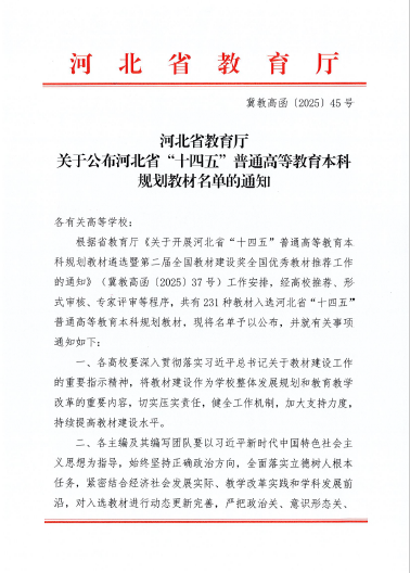 教材是教育教学的核心载体与重要工具,承载着传播知识、传递国家民族价值观念体系的重要使命。beat365英国官方网站始终高度重视教材建设,深入贯彻落实习近平总书记关于教材建设工作的重要指示和习近平新时代中国特色社会主义思想,将其置于教育教学改革的关键位置,加强统筹规划与支持力度,近期入选省规划教材便是成效的体现。