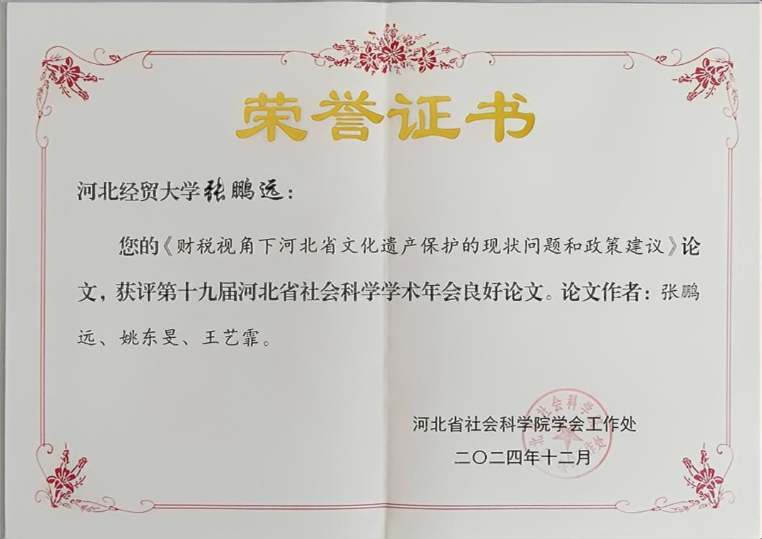 近日,beat365官网教师张鹏远与中央财经大学姚东旻、王艺霏共同撰写的《财税视角下河北省文化遗产保护的现状问题和政策建议》,获得第十九届河北省社会科学学术年会良好论文。