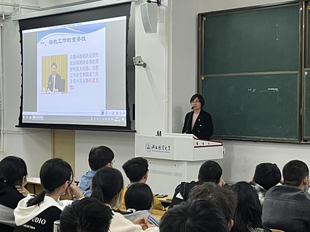 胡卓理指出,宗教问题是我们党治国理政必须处理好的重大问题,宗教工作在党和国家工作全局中具有特殊重要性。大学时期是一个人确立世界观、人生观、价值观的关键阶段,作为人才培养基地,高校引导同学们正确了解宗教知识,是职责所在。大学校园要认真贯彻执行党的宗教政策和方针,坚持马克思列宁主义,坚持辩证唯物主义世界观,主张无神论,共产党员、共青团员都不能信仰宗教。她分别从宗教概念、宗教的社会作用及马克思主义政党的基本态度和原则三个角度,重点介绍了马克思主义宗教观。