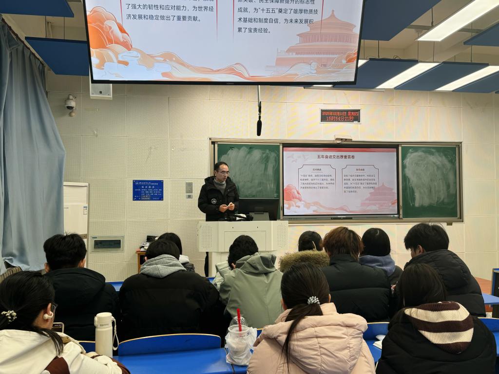 2025年12月11日,财政系教工党支部开展党的二十届四中全会精神专题党课,党支部组织委员仝文涛作“奋楫‘十五五’宣讲 ”。财政系教工党支部全体成员和部分学生参加。