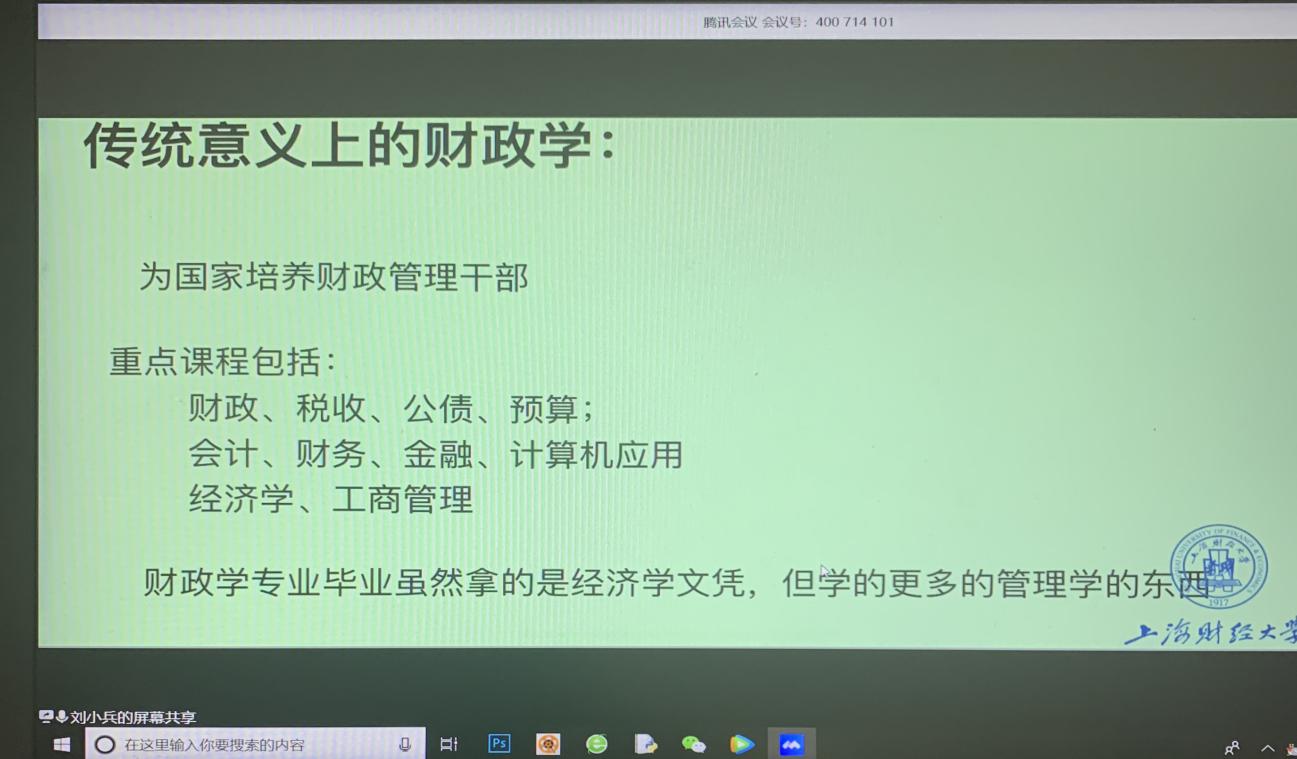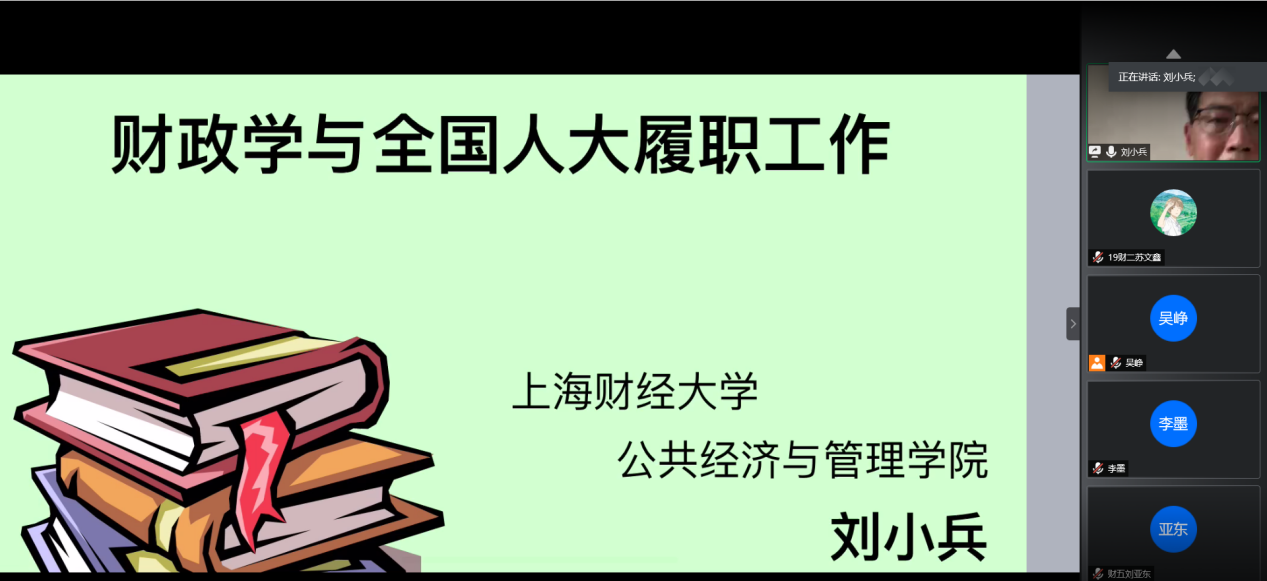 6月1日下午,上海财经大学公共经济与管理学院院长、博士生导师、第十三届全国人大代表刘小兵教授应beat365英国官方网站邀请,通过腾讯会议平台为同学们作题为“财政学与全国人大履职”的报告。本次报告由王晓洁院长主持,仇晓洁院长做点评,beat365英国官方网站部分师生共200余人在线聆听了本次报告。