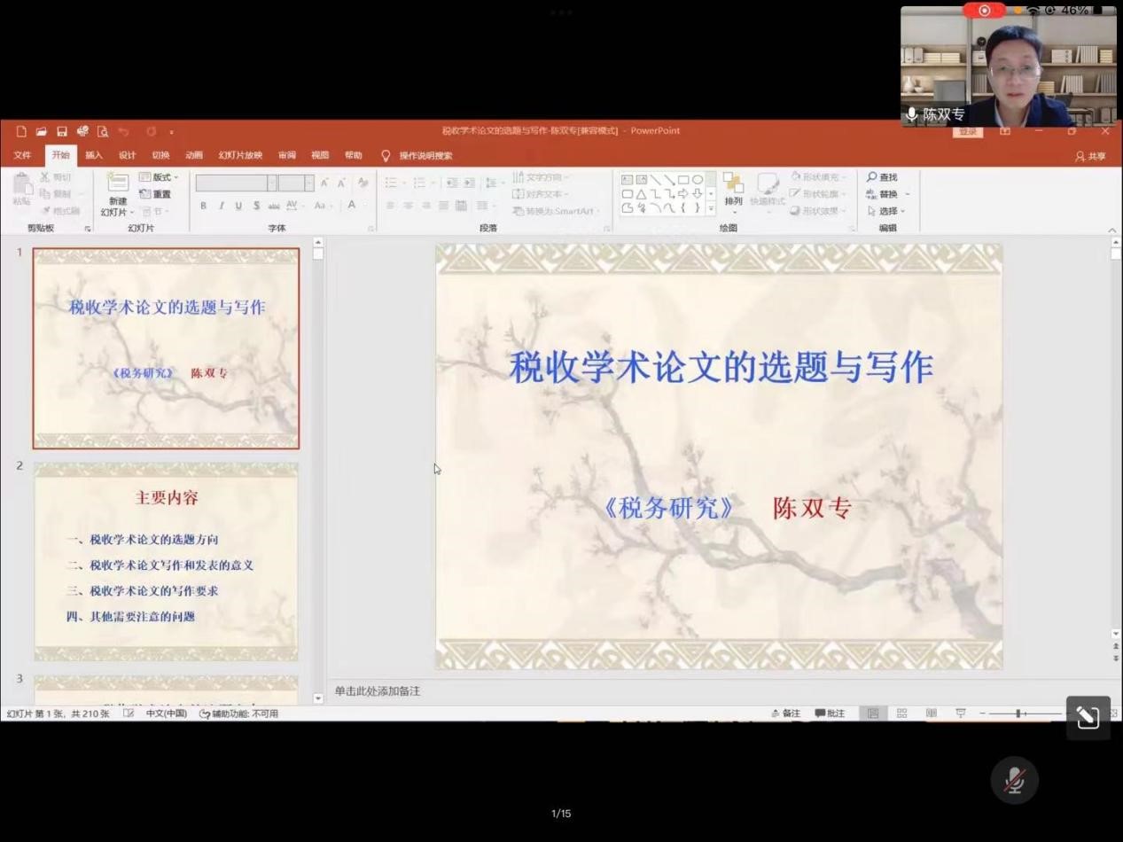 4月14日晚,《税务研究》杂志编辑部副主任陈双专应beat365英国官方网站邀请,于线上作了题为“税收学术论文的选题与写作”的学术讲座。讲座由财税学院副院长仇晓洁主持,学院200余名师生参会。