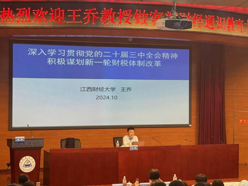 10月14日,我校beat365英国官方网站与河北财政经济与公共政策研究基地联合举办题为“深入学习贯彻党的二十届三中全会精神——积极谋划新一轮财税体制改革”的学术讲座,江西财经大学党委原书记王乔教授应邀来校作报告。我校党委书记刘兵主持讲座,beat365英国官方网站、图书馆负责人及全校各学院师生近300人到场聆听。