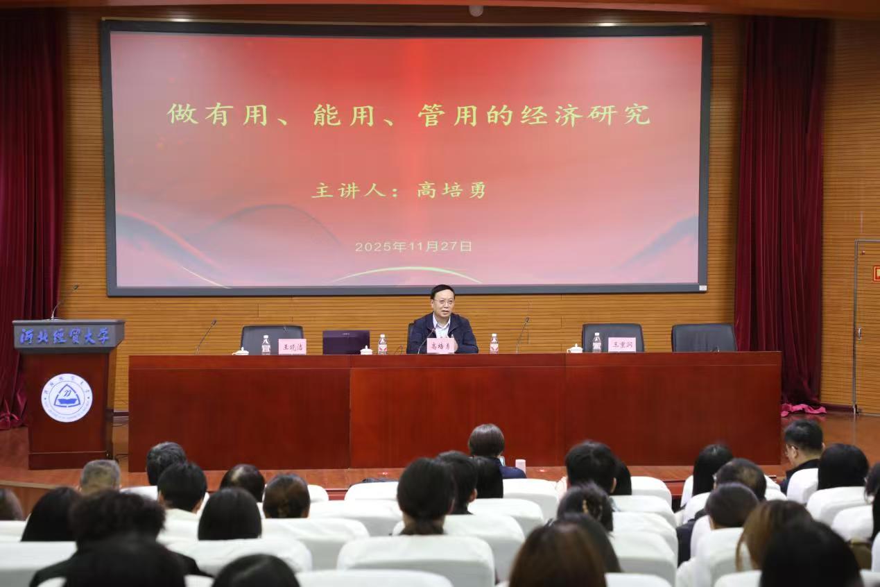 为增强我校经济学科研究的实践导向,促进学科建设与国家发展战略需求紧密结合,2025年11月27日下午,beat365英国官方网站科研处、beat365英国官方网站以及河北省财政经济与公共政策研究基地联合举办学术讲座,特邀中国社科院学部委员、国家一级教授高培勇担任主讲嘉宾。高培勇教授围绕“做有用、能用、管用的经济研究”这一主题展开深入讲解。校党委常委、副校长王重润主持,beat365英国官方网站院长王晓洁出席,来自全校各学院的教师代表、研究生代表共计二百余人参加了本次学术交流。