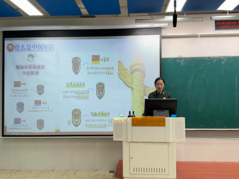 秦碧柔从国防是什么,我国的周边安全形势,什么是中国军队,全民国防四个板块出发,为学生们介绍了国防建设的意义,阐述了我国国防建设的成就以及面临的挑战,强调了每一位公民在维护国防安全中的责任与担当,增强了学生们的国防意识,激发了学生们为国家国防安全贡献力量的热情。